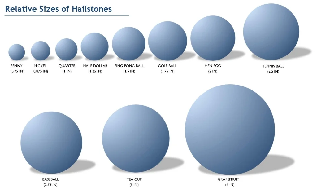 3/4" _ Threshold size for damage to roil roofing and deteriorated asphalt composition shingles, especially where unsupported. Painted wood surfaces, deteriorated gray-black slates (especially at comers) chipped. Most aluminum vents, flashings, valleys, siding dented.