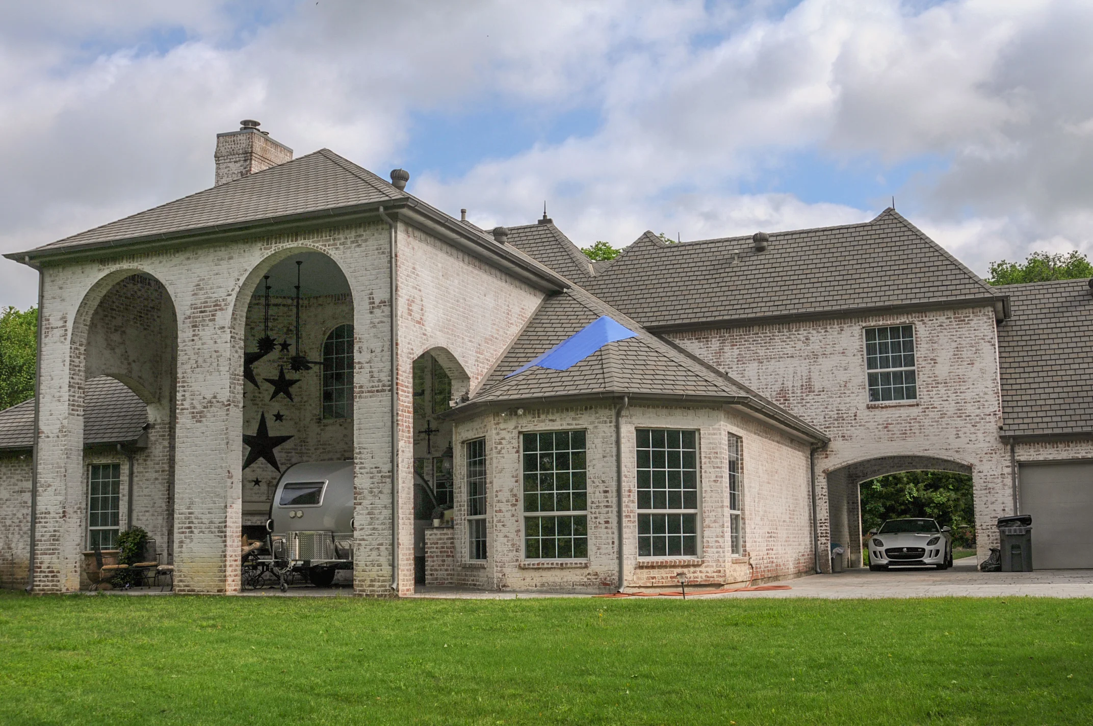 Blue area on roof indicates tarp placed over damaged area of roof to prevent water leakage into interior of home.